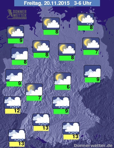 In der Nacht zum Freitag zieht sich der Regen auf den Süden von Deutschland zurück, hier fällt jedoch oft auch starker und ergiebiger Regen. Über der breiten Mitte ist es teils noch stark, teils auch schon aufgelockert bewölkt und zumeist trocken. Im Norden Deutschlands ist es meist locker bewölkt oder sternenklar und dazu trocken. Vor allem im Küstenumfeld sind jedoch auch einzelne Schauer und auch kurze Gewitter möglich. Die Temperatur sinkt auf 13 Grad in Freiburg und bis etwa 6 Grad im Grabfeld. Sowohl im Norden als auch im Süden des Landes weht ein frischer bis starker und in Böen stürmischer Wind, dabei sind auch noch weitere Sturmböen möglich.