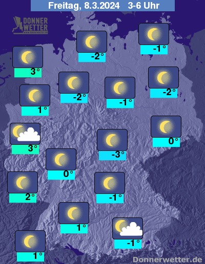 In der Nacht auf Freitag ist der Himmel meist nur gering bewölkt oder die Sterne funkeln von einem wolkenlosen Himmel. In den frühen Morgenstunden kann sich gebietsweise Nebel oder Hochnebel bilden.