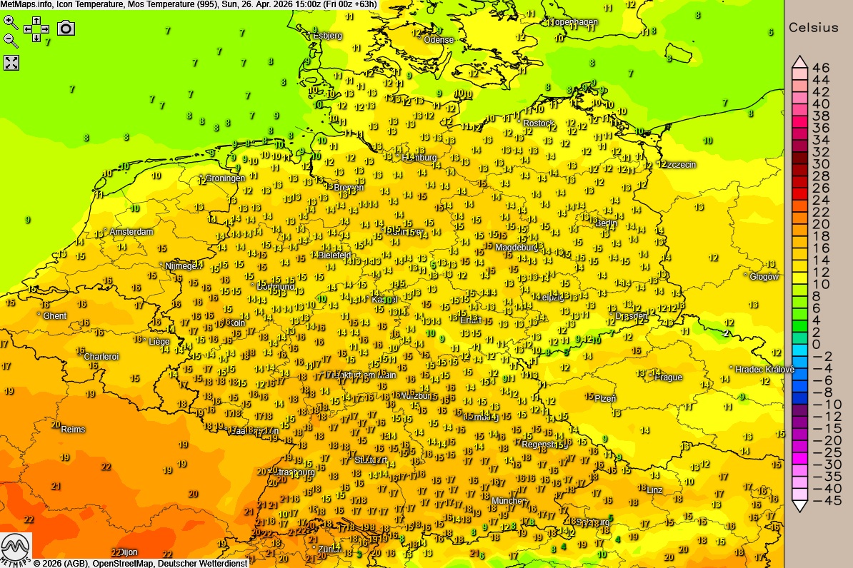 Die Wetter- und Temperaturkarte für Sonntagnachmittag nach ICON: