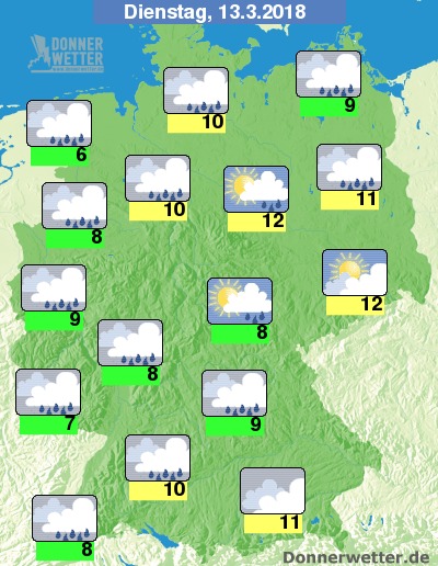 Im Osten gibt es zunächst größere Aufheiterungen. Sonst dominieren aber die Wolken und zeitweise fällt Regen, oder es treten Schauer auf. Im Zustrom kälterer Luft kann es gegen Abend im Bergland auch schneien. Die Höchsttemperaturen erreichen in Sachsen-Anhalt und Brandenburg mit sonniger Unterstützung nochmals milde 11 bis 14 Grad, sonst gehen sie auf 5 bis 10 Grad zurück. Der Wind frischt zeitweise böig auf und dreht im Tagesverlauf von Südwest auf West bis Nordwest. In der Nacht auf Mittwoch klart der Himmel im Westen gebietsweise auf und es kann stellenweise zu leichtem Frost kommen.