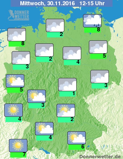 Am Mittag und Richtung frühen Nachmittag ist der Himmel in der Nordhälfte Deutschlands bedeckt, Richtung Ostsee sind auch Niederschläge möglich. Im Süden Deutschlands schafft es die Sonne vermehrt durch eine leichte Wolkenschicht und es bleibt trocken. Ganz im Südosten ist der Himmel frei von Wolken.