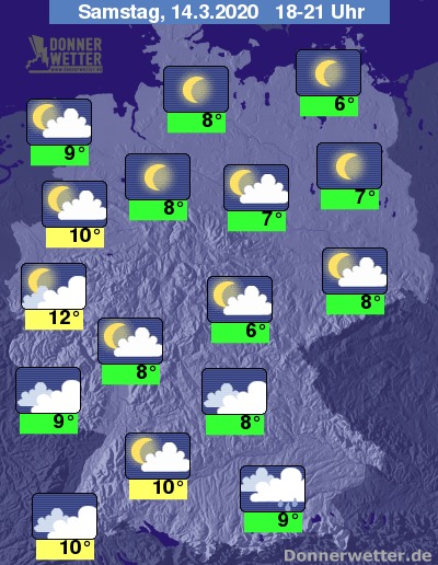 Heute Abend sind im Süden bei oft starker Bewölkung noch vereinzelte Schauer möglich. Über dem Norden und Osten ist es nur locker bewölkt oder sternenklar, im übrigen Land oft locker bewölkt, dazu bleibt es trocken. Die Temperatur liegt bei 6 Grad in Rostock und bis zu 12 Grad in Köln.