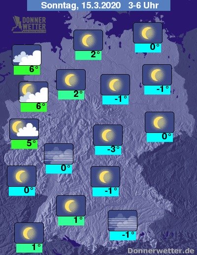 In der Nacht zum Sonntag zeigt sich der Himmel über dem Land verbreitet sternenklar, lediglich über den westlichen Landesteilen ziehen mehr und zum Teil auch dichte Wolken durch, dazu bleibt es trocken. Die Temperatur sinkt auf 6 Grad am Niederrhein und bis auf -3 Grad im Eichsfeld.