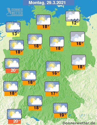 Am Montag ist es im Land verbreitet heiter bis sonnig, im Norden und Osten ziehen jedoch oft auch einige, teils dichte Wolken durch, Regen fällt dabei aber nur selten, sonst bleibt es komplett trocken. Die Temperatur erreicht 12 Grad in Rostock und bis 20 Grad in Freiburg.