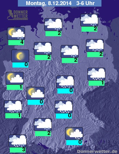 Am Montag fällt besonders am Alpenrand und gebietsweise im übrigen Süddeutschland noch zeitweise Schnee, Schneeregen oder Regen, sonst ist es häufig aufgelockert bewölkt, vor allem von der Mitte bis nach Norddeutschland auch häufig heiter bis sonnig, teils hält sich hier aber auch hochnebelartige Bewölkung. Dabei bleibt es zunächst trocken, jedoch zieht zum Abend hin im Westen und Nordwesten dichte Bewölkung mit Regen, Schneeregen und Schnee auf. Dabei kann es teils glatt auf den Straßen werden. Die Temperatur steigt auf 1 Grad im Vogtland und bis 5 Grad in Freiburg.