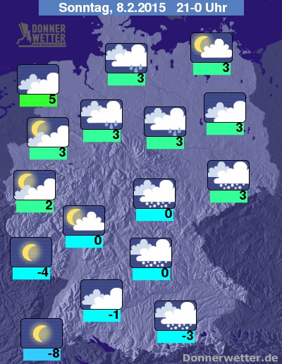 Heute Abend ist es teils noch aufgelockert bewölkt und trocken, es ziehen aber zunehmend dichtere Wolken auf und gebietsweise setzt leichter Regen ein. Im Osten und Süden des Landes fällt nachfolgend zeitweise Schnee. Meist sternenklar bleibt der Himmel im äußeren Südwesten des Landes, hier bleibt es trocken. Die Abendtemperatur liegt bei 5 Grad an der Nordsee und um -8 Grad am Schwarzwald.