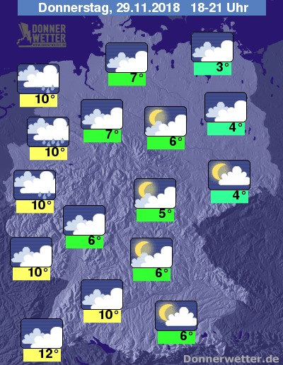 Am Abend ist es teils trübe, teils aufgelockert, vom Rheinland bis zur Nordsee fällt gelegentlich etwas Regen oder Sprühregen.
