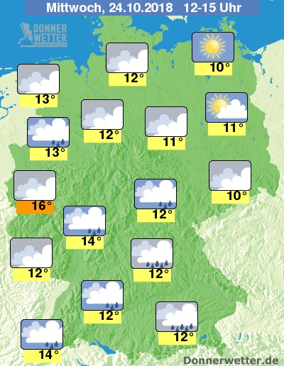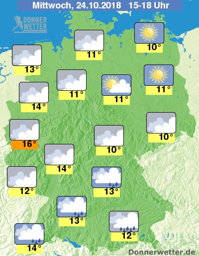 Am frühen Nachmittag präsentiert sich der Himmel über weiten Landesteilen herbstlich grau in grau. Vor allem über der Mitte und im Süden regnet oder nieselt es zeitweise, im Stau der Alpen auch kräftiger. In Mecklenburg-Vorpommern und Brandenburg gibt es längere freundliche Abschnitte mit Sonnenschein. Dafür bleibt es hier aber auch mit 10 oder 11 Grad am kühlsten. Am mildesten mit bis zu 16 Grad wird es in der Kölner Bucht.
