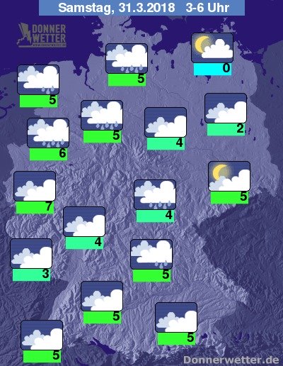 In der Nacht zum Samstag breiten sich die kompakten Regenwolken nordostwärts aus und erreichen bis zum Morgen auch den Norden und die Mitte des Landes, auch im Süden fällt unter dichten Wolken gebietsweise Regen. Trocken und dennoch meist stark bewölkt ist es im Osten und Nordosten. Die Temperatur sinkt auf 7 Grad in Bonn und etwa 0 Grad in Neubrandenburg.