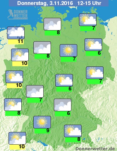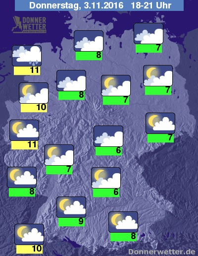 Am Abend ziehen dann fast im ganzen Land auch einige dichtere Wolken durch, nass wird es jedoch weiterhin nur in Richtung Nordsee. Zwischen Elbe und Alpenrand funkeln hingegen zeitweise auch die Sterne.