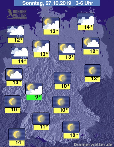 In der Nacht zum Sonntag bleibt der Himmel über der Südosthälfte Deutschlands verbreitet sternenklar oder es ziehen nur wenige Wolken durch. Dagegen ziehen von der Nordsee bis in den Norden und Westen Deutschlands dichte Wolken, die auch gebietsweise Regen bringen. Im übrigen Land bleibt es trocken bei Tiefstwerten von 14 Grad in Münster und bis 9 Grad am Taunus.