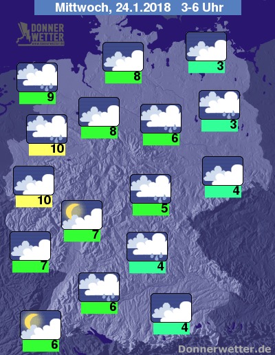 In der Nacht zum Mittwoch bleibt die Wolkendecke über Deutschland weitestgehend geschlossen, dabei breiten sich die meist leichten Regenfälle vom Westen des Landes im Laufe der Nacht bis auf die östlichsten Landesteile hin aus. Die Tiefstwerte liegen bei milden 10 Grad in Köln und etwa 3 Grad in Neubrandenburg.