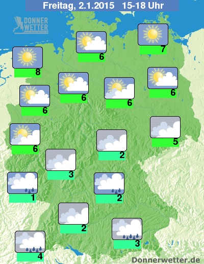 Heute Nachmittag bleiben die Wolken in der Südhälfte Deutschlands weitgehend verschlossen und es fällt zeitweise Regen, vor allem im Stau der Nordalpen fällt der Regen zum Teil kräftig und ergiebig. Stellenweise ist anfangs noch mit gefährlicher Straßenglätte durch überfrierende Nässe zu rechnen. Nach Norden hin lockert die Bewölkung dagegen verbreitet auf, vor allem im Norden ist es dabei auch häufig heiter bis sonnig, dazu bleibt es trocken. Die Temperatur liegt bei 1 Grad am Pfälzer Wald und bis 8 Grad an der niederländischen Grenze.