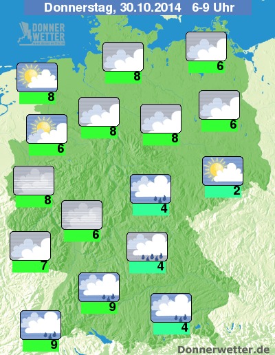 Nach dem Aufstehen wird man am Donnerstagmorgen meist von einer dichten Wolkendecke "begrüßt". Nur im äußersten Nordwesten sowie entlang des Erzgebirges kann sich dieser vorletzte Oktobermorgen auch mal ein wenig freundlicher zeigen. Im Süden muss zudem örtlicher Regen eingeplant werden. Die Werte liegen bei kühlen 2 Grad in der Oberlausitz und um 9 Grad in Teilen Baden-Württembergs.