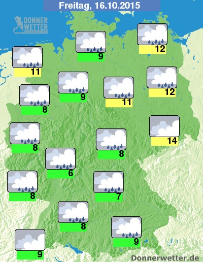Heute bleibt der Himmel über dem Land verbreitet dicht bewölkt, dazu fällt immer wieder, besonders im Norden Deutschlands auch teils langanhaltender Regen. Die Temperatur steigt auf nasskalte 6 Grad am Westerwald und bis auf 14 Grad an der Neiße.