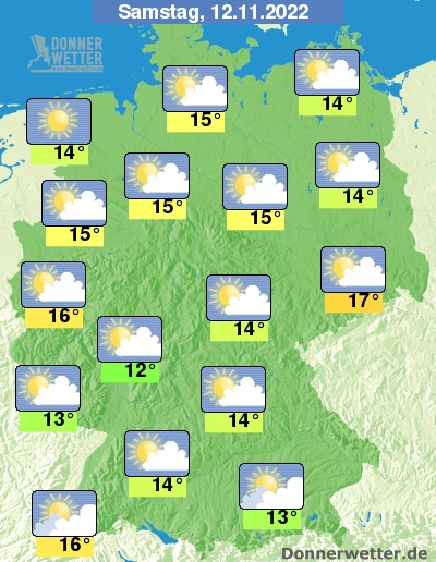 Am Samstag ist im Süden und im Ostseeumfeld oft Nebel oder Hochnebel möglich, ansonsten ist es jedoch oft heiter oder teilweise ziehen einige Wolken durch. Es bleibt landesweit trocken bei Werten von 12 Grad in Wiesbaden und bis 17 Grad in Chemnitz.