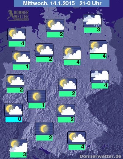 In der Nacht zum Donnerstag klingen auch im Osten die Niederschläge ab und der Himmel lockert nach und nach auf, in den anderen Landesteilen ist es bereits meist aufgelockert bewölkt, teils auch sternenklar und trocken. Im Laufe der zweiten Nachthälfte ziehen im Westen und Norden jedoch erneut dichte Wolken auf und es fällt zeitweise Regen, in der Südosthälfte Deutschlands bleibt es bis zum Morgen noch weitgehend trocken. Die Temperatur sinkt auf 3 Grad an der Nordsee und auf -2 Grad in Franken. Im Norden und Westen weht ein teils starker bis stürmischer Wind mit möglichen Sturmböen. Auf den Hochlagen der Mittelgebirge und an der Nordseeküste ist es stürmisch mit teils schweren Sturmböen.