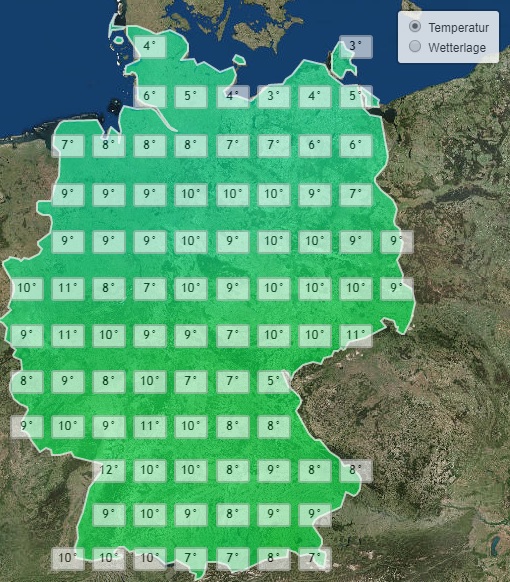 Dabei pendeln sich die Höchsttemperaturen in vielen Landesteilen bei Werten um die 10 Grad ein. Wesentlich kühler bleibt es nur im Norden des Landes. Unter dem Einfluss kühlerer Luftmassen über Skandinavien steigt das Thermometer hier nur auf Werte um die 5 Grad, insbesondere an der Ostsee bleibt es bei Temperaturen um die 3 Grad noch etwas kühler.