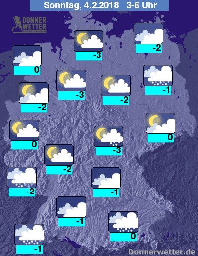 In der folgenden Nacht halten sich über dem Süden dichte Wolken, dazu fällt gebietsweise Schnee. Größtenteils dichte Wolken halten sich auch von der Landesmitte bis nach Ostdeutschland und im Nordseeumfeld, dabei sind Schneefälle möglich. Im übrigen Bndesgebiet ist es meist locker oder aufgelockert bewölkt und dazu trocken. Die Temperatur sinkt auf 0 Grad im Rheinland und bis -3 Grad im Grabfeld.