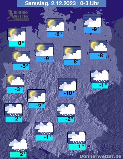 Die Temperaturen liegen am Nachmittag bei Werten um -3 bis 4 Grad, in der Nacht zurückgehend auf 2 Grad am Oberrhein und teils -10 Grad in der Landesmitte.