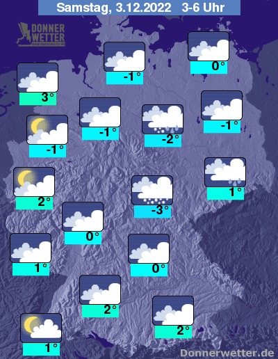 In der Nacht zum Samstag fällt von der Mitte des Landes bis in den Osten gebietsweise Schnee, zum Teil auch Schneeregen oder Regen. Hierbei ist verbreitet mit glatten Straßen durch Schnee oder überfrierender Nässe zu rechnen!! Im übrigen Land ist es ebenfalls meist bedeckt und nur selten zeigen sich Auflockerungen, dazu bleibt es trocken. Stellenweise bildet sich Nebel. Die Temperatur sinkt auf 3 Grad in Bremerhaven und -3 Grad in Jena.
