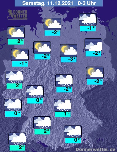 In der Nacht auf Samstag ändert sich nur wenig beim Wetter - in der Nordhälfte des Landes überwiegt lockere Bewölkung am Himmel, in den frühen Morgenstunden kann sich auf Nebel bilden, und es bleibt meist niederschlagsfrei. Im Süden ist es meist stark bewölkt oder bedeckt und immer wieder muss mit Schauern gerechnet werden. Diese fallen in tiefen Lagen meist als Schneeregen oder Regen, oberhalb von 200 bis 400 m als Schnee.