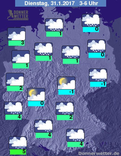 In der folgenden Nacht bleibt der Himmel größtenteils dicht bewölkt, dabei fällt im Süden zum Teil langanhaltender Regen, teils auch Schneeregen. In den anderen Landesteilen fällt zeitweise Regen, Schneeregen, Schnee und hier und da auch gefrierender Regen, dabei ist mit erhöhter Glättegefahr zu rechnen! Trocken bleibt es weitgehend westlich des Mittel- und Niederrheins. Die Temperatur sinkt auf 5 Grad in Freiburg und bis auf -1 Grad im Thüringer Becken.