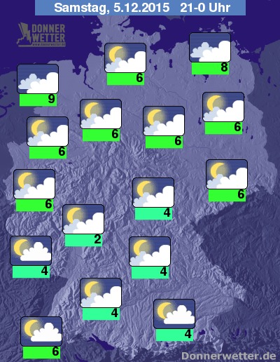 Heute Abend zeigt sich der Himmel im Norden meist stark oder dicht bewölkt, weiter nach Süden hin ist es ebenfalls meist stark, zeitweise aber auch aufgelockert bewölkt. Im Alpenvorland ist es auch oft nur locker bewölkt. Es bleibt landesweit trocken bei Abendtemperaturen von 9 Grad an der Nordsee und um 2 Grad am Taunus. An Nord- und Ostsee herrscht verbreitet Sturm, dabei sind auch einzelne orkanartige Böen möglich, im übrigen Norden weht der Wind meist frisch bis stark und in Böen auch stürmisch.
