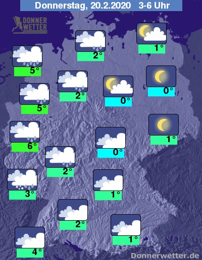 Während der zweiten Nachthälfte zieht von Westen das Niederschlagsgebiet einer Warmfront zu uns herein. In höheren Lagen können sich zumindest anfangs auch Flocken unter die Tropfen mischen. Nordöstlich der Mittelgebirge kann man dagegen noch für längere Zeit die Sterne genießen, während sich der Himmel sonst mit Wolken eintrübt.