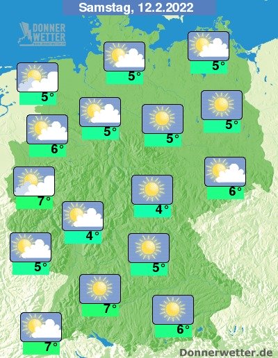 Am Samstag zeigt sich das Wetter über dem Land vielerorts heiter bis sonnig. Im Tageserlauf können im Westen und Norden allerdings oft auch dichte Wolken aufziehen, es bleibt aber landesweit trocken. Die Temperatur steigt auf 4 Grad in in Erfurt und bis 7 Grad in Köln. An der Nordsee weht ein oft stürmischer Wind.