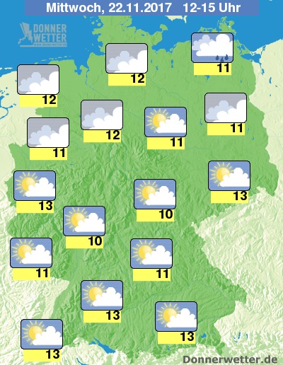 Heute Nachmittag bleibt es im Norden und Nordosten überwiegend stark bewölkt und es fällt hier zeitweise Regen. Im übrigen Bundesgebiet zeigt sich das Wetter oft locker bis aufgelockert bewölkt, im Tagesverlauf sogar oft sonnig, dabei bleibt es trocken. Die Temperatur steigt auf milde 10 bis 13 Grad.