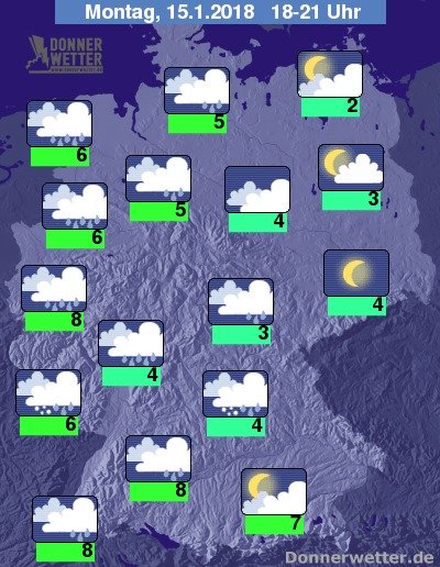 Heute Abend breiten sich die kompakten Regenwolken weiter nach Osten hin aus. Im Süden und Südosten ist im Verlauf auch Schneeregen möglich. Trocken und oft noch gering bis aufgelockert bewölkt ist es noch von Vorpommern bis nach Sachsen, sowie im äußeren Südosten der Republik. Die Temperatur liegt bei 2 Grad in Stralsund und 8 Grad in Köln. An den Küsten weht ein oft stürmischer Wind, dabei treten auch Sturmböen auf.