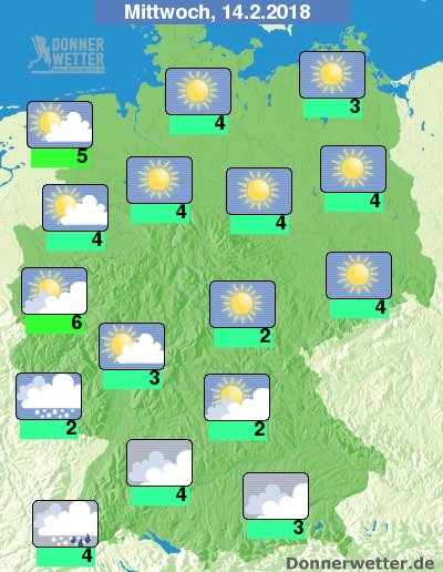 Am Mittwoch bleibt es über dem Süden und äußeren Westen häufig stark, zum Teil wechselnd bewölkt, dabei ist hier und da etwas Schnee möglich, im übrigen Land ist es hingegen verbreitet heiter bis sonnig, dabei bleibt es trocken. Die Temperatur steigt auf 2 bis 6 Grad.