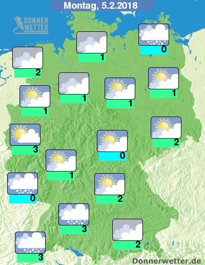 Am Montag bleibt es besonders im Südwesten und Norden meist stark bewölkt, dazu fällt auch gebietsweise Schnee. Im übrigen Bundesgebiet ist es oft trüb oder stark bewölkt, zeitweise aber auch aufgelockert bewölkt, dabei ist es größtenteils trocken. Die Temperatur steigt auf Werte zwischen 0 und 3 Grad.
