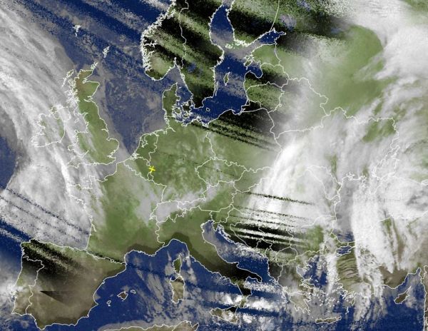 Das Satellitenfoto von heute Morgen zeigt einen breiten Tiefausläufer, der sich von der Iberischen Halbinsel nordwärts, über die Biskaya und die Westhälfte der Britischen Inseln erstreckt. In diesen Regionen fällt oft kräftiger und langanhaltender Regen, zudem weht ein oft stürmischer Wind.