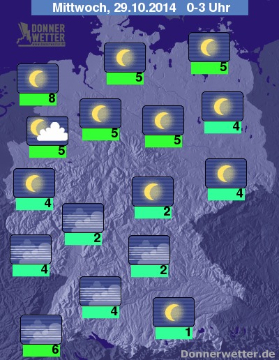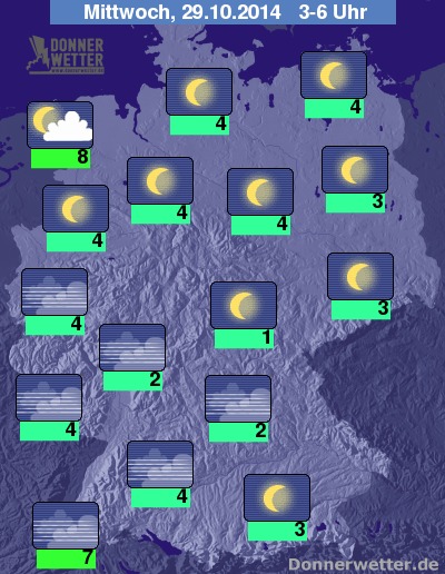 Bis zum frühen Mittwochmorgen kühlt es dann auch kräftig ab - die Tiefstwerte erreichen dann immerhin noch 8 Grad  C im Emsland, im Thüringer Wald aber schon kühle 1 Grad C.