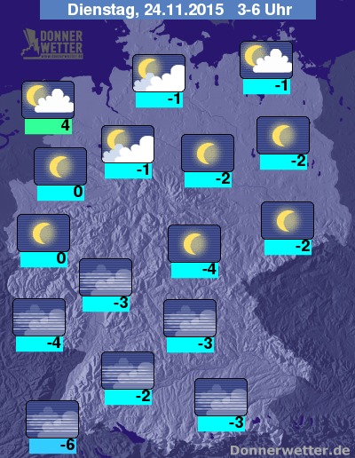 In der Nacht zum Dienstag klart der Himmel auch über dem Osten und Süden des Landes verbreitet auf, im übrigen Bundesgebiet ist es bereits meist sternenklar, dabei bleibt es trocken. Gegen Morgen ziehen im Norden und Nordwesten einige, meist noch aufgelockerte Wolken auf, dazu bleibt es weiterhin trocken. Die Temperatur sinkt auf 4 Grad im nördlichen Emsland und bis auf -6 Grad am Bodensee. Stellenweise ist mit Glätte durch überfrierende Nässe zu rechnen.
