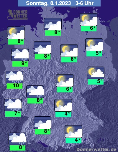 In der Nacht zum Sonntag ziehen in den westlichen Landesteilen kompakte Wolken auf und es setzt hier verbreitet Regen ein. Im übrigen Land bleibt es teils aufgelockert, zunehmend jedoch stark bewölkt, jedoch trocken. Die Temperatur sinkt auf 10 Grad in Köln und 4 Grad in München.