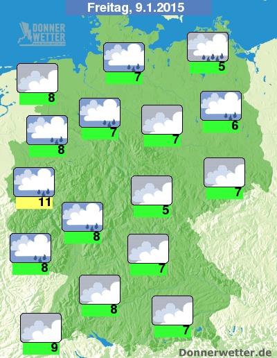 Heute bleiben wir landesweit unter einer weitgehend verschlossenen und dunklen Wolkendecke, dazu fällt immer wieder, zum Teil kräftiger Regen. Im Süden des Landes bleibt es jedoch meist trocken, hier kann es ganz vereinzelt auch mal etwas auflockern. Die Temperatur steigt auf 5 Grad am Stettiner Haff und bis 11 Grad in Aachen. Es weht verbreitet starker bis stürmischer Wind, in Böen erreicht der Wind Sturmstärke. An den Küsten und auf den Hochlagen der Mittelgebirge sind Orkanböen möglich.
