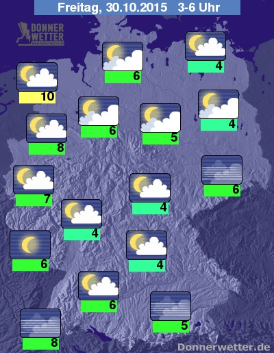In der folgenden Nacht ist es im Norden Deutschlands überwiegend aufgelockert bis stark, zum Teil auch nur locker bewölkt. In den südlicher gelegenden Landesteilen ist es dagegen größtenteils locker bewölkt, nach Südosten hin sowie im äußeren Osten auch oft sternenklar. Es bleibt überall trocken bei Tiefstwerten von 10 Grad an der Nordsee und bis 4 Grad im Coburger Land. Im Süden, der Mitte und im Osten des Landes ist Nebel oder Hochnebel möglich.