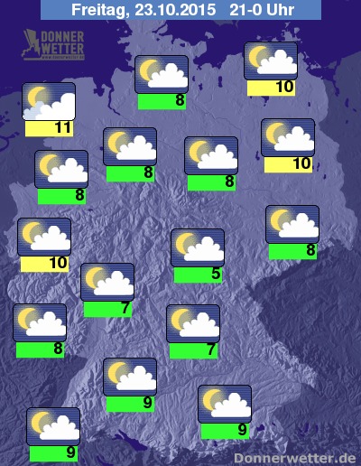 Heute Abend ziehen über Deutschland überwiegend nur lockere Wolkenfelder hinweg, hier und da ziehen auch mal mehr Wolken durch, im äußeren Süden ist es häufig sternenklar, dazu bleibt es landesweit trocken. Die Abendtemperatur liegt bei 11 Grad an der Nordsee und um 5 Grad in Oberfranken.