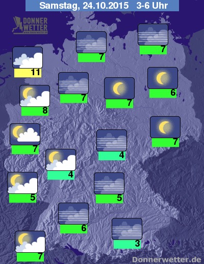 In der Nacht zum Samstag klart der Himmel insbesondere über der Osthälfte der Republik weiträumig auf, aber auch weiter westlich wird es teils sternenklar, dabei ist hier und da Nebel möglich. In den westlichsten Bundesländern ist es hingegen öfter auch stark, sonst meist aufgelockert bewölkt, dabei bleibt es trocken. Die Temperatur sinkt auf 11 Grad an der See und bis etwa 3 Grad in Augsburg. Im Süden und Osten ist in den Morgenstunden stellenweise Glätte durch Rauhreif möglich!