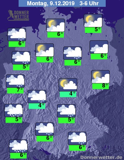 Die neue Woche startet an Rhein, Weser und Donau mit dichten Wolken, aus denen immer wieder Regen fällt, im Schwarzwald auch Schneeregen. In der Mitte wechseln sich Sonne und zeitweise starke Bewölkung ab, regional ist es auch heiter, und es bleibt meist trocken. Der Wind weht mäßig bis frisch, in Böen auch stürmisch.