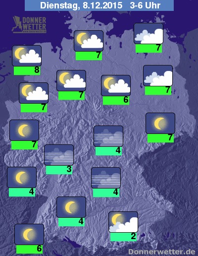 In der Nacht zum Dienstag ist es zunächst vor allem über der Nordhälfte noch oft aufgelockert und teils stark bewölkt, jedoch trocken, im übrigen Land ist es bereits meist sternenklar und im weiteren Verlauf klart der Himmel auch über der breiten Landesmitte meist auf. Im Norden bleibt es bis zum Morgen hin bei einigen Wolken, dazu bleibt es weiterhin trocken. Die Tiefstwerte liegen bei 8 Grad in Papenburg und etwa 2 Grad in Nürnberg. Stellenweise bildet sich Nebel oder Hochnebel.