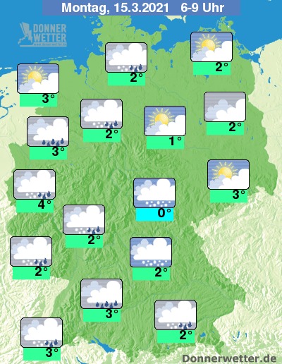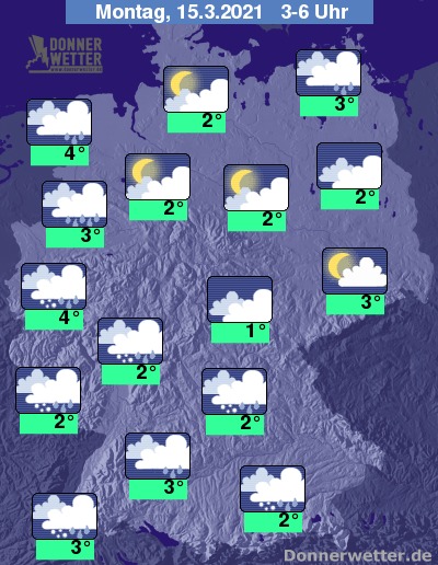 In der Nacht auf Montag verdichten sich die Wolken auch über der Nordhälfte Deutschlands wieder, Auflockerungen beschränken sich bis zu den frühen Morgenstunden dann vor allem noch auf das Gebiet zwischen Weser und Elbe. Hier sowie entlang der Oder bleibt es im Zuge häufiger trocken, in den übrigen Landesteilen muss verbreitet mit schauerartigem Regen gerechnet werden, im Bergland fällt auch Schnee.