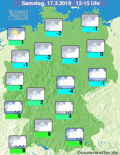 Heute Nachmittag bleibt es über dem Land verbreitet wolkenverhangen, Auflockerungen sind am ehesten im Umfeld von Nord- und Ostsee möglich, dabei bleibt es hier, wie auch im übrigen Norddeutschland weitgehend trocken. Über der Südhälfte des Landes fällt hingegen gebietsweise Schnee, im Süden meist Regen oder Schneeregen. Die Temperatur liegt bei -2 bis 8 Grad.