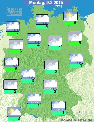 Am Montag bleibt die Wolkendecke fast landesweit verschlossen, die besten Chancen auf zumindest etwas Sonnenschein bieten sich noch an der Ostsee, sowie am Oberrhein. Dazu fällt in der Nordhälfte Deutschland gelegentlich Regen oder Sprühregen, im Süden fallen die Niederschläge überwiegend als Schnee, dazu besteht Glättegefahr. Im Nordosten bleibt es hingegen verbreitet auch trocken. Die Höchstwerte erreichen 1 Grad in Oberschwaben und bis 7 Grad in Ostfriesland. Im Osten und Südosten weht anfangs noch ein teils starker und in Böen auch stürmischer Wind.