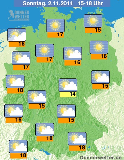 Am Wochenende wird es nochmals schön, aber auch, wenn die Spitzenwerte noch 15-18 Grad C am Samstag und Sonntag erreichen, die Jacken-, Mantel- und Hosenzeit ist nun wirklich gekommen. Morgens liegen die Werte bei Nebel und Hochnebel zwischen 5 und 8 Grad C. Mehr Deutschlandwetter finden Sie hier.