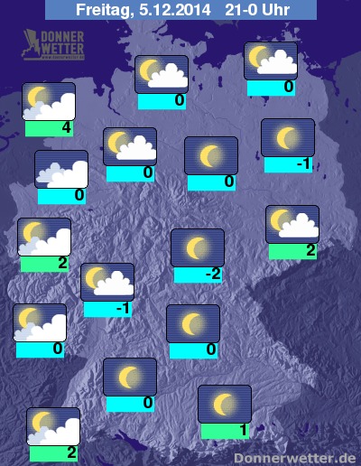 Heute Abend kann die Bewölkung vor allem vom Süden, über die Mitte Deutschlands bis nach Osten hin zeitweise aufklaren, sonst ist es teils aufgelockert, teils stark bewölkt und es bleibt weitgehend trocken. Die Abendwerte liegen bei 4 Grad an der Nordseeküste und etwa -2 Grad am Thüringer Wald.