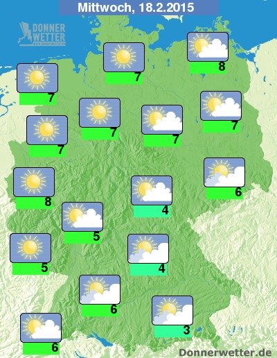 Am Mittwoch hält sich häufig noch, zum Teil zäher Nebel oder Hochnebel, da wo sich dieser auflösen kann, scheint jedoch verbreitet die Sonne. Besonders im Westen und Norden bestehen gute Chancen auf Sonnenschein. Es bleibt landesweit trocken. Die Höchstwerte erreichen 3 Grad in München und bis 8 Grad in Rostock.